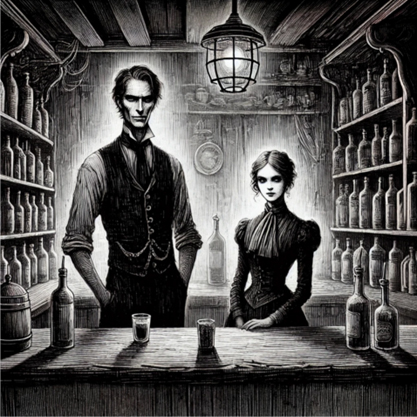 Behind the bar stood two people—a tall, gaunt man with sharp features and a woman with dark hair and eyes that seemed to hold the weight of many lifetimes. They turned to look at her, exchanging a glance before the man gave her a polite nod.